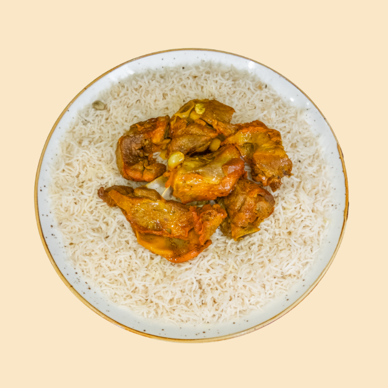 لحم مندي طري يُقدَّم مع رز بشاور طويل الحبة بنكهة متوازنة.